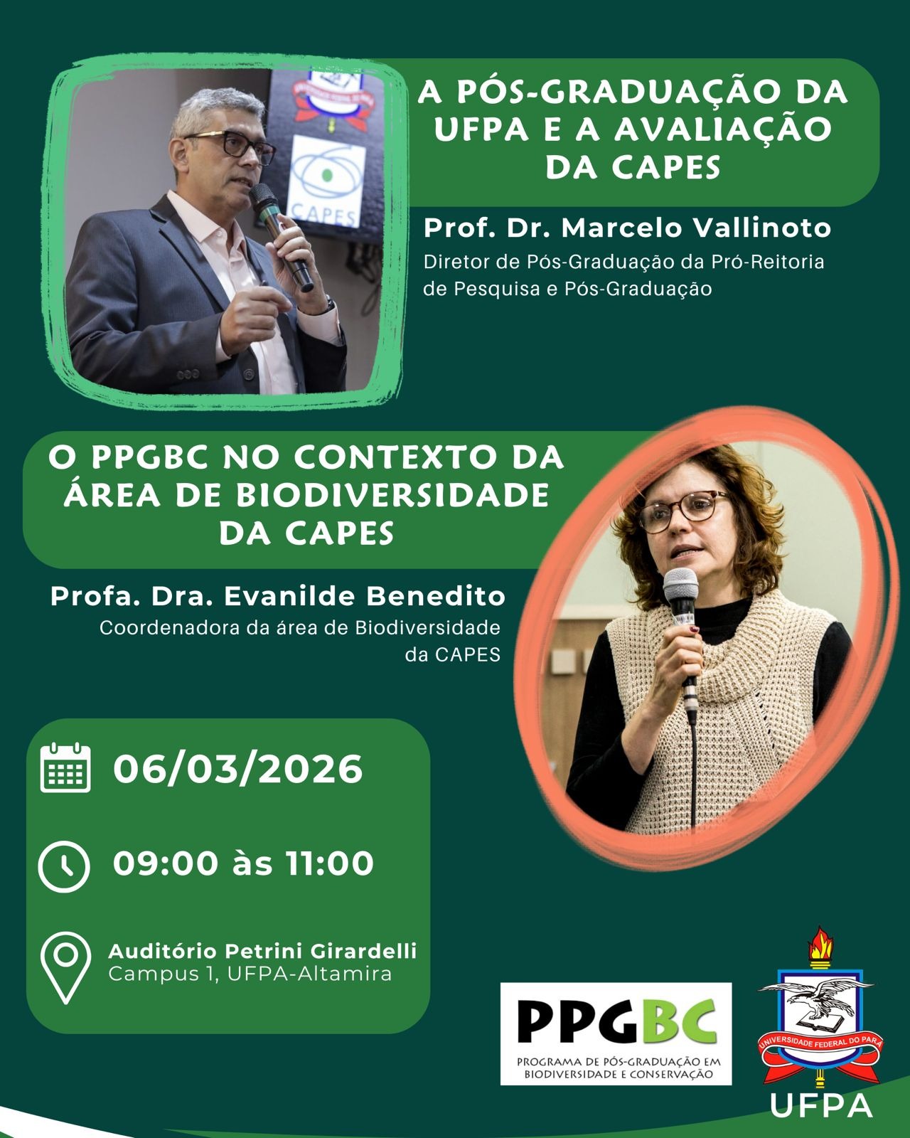 O PPGBC convida a comunidade acadêmica para um encontro estratégico para debater sobre o panorama da pós-graduação no Campus de Altamira e os critérios de avaliação da CAPES, nessa sexta-feira, 6 de março de 2026, das 9 às 11h, no Auditório Petrini Girardelli.